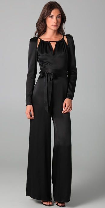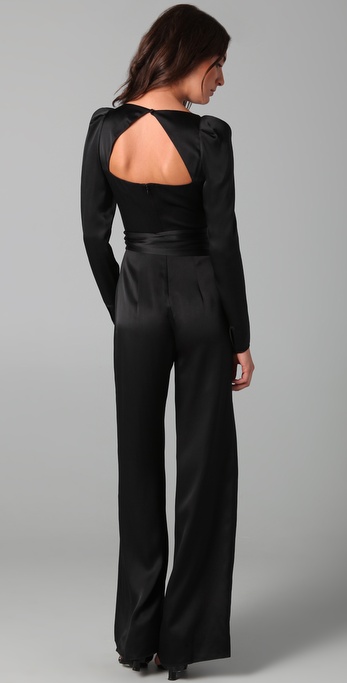 Temperley London's Silk Black Jumpsuit's exquisite neckline and backline make this outfit pop. This is best worn by a taller, thin built woman with heels. Great with a fun clutch or bag and heels. A cocktail ring and large colored statement earrings complete the look. $973.