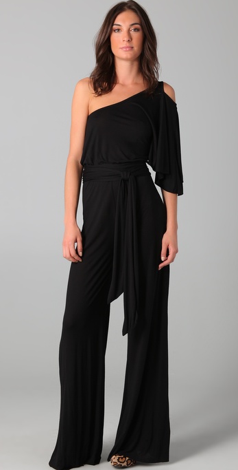 The ruffle side shoulder detail makes this jumpsuit stand out. Another way to wear this is to remove the black belt and add a jeweled belt and sparkling heels. Or try it with a colored belt and clutch in complimentary tones. Bebe, $98.