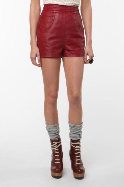 Another fun option is leather. Try red leather shorts. These are a great option to wear in winter. Add textured tights, heels and a fun blouse to create a look. This is a high waist pair, from Urban Outfitters, $39.99.