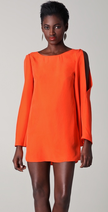 Tangerine is a must have color for 2012. It is the color of the year. The asymmetrical hem and ruching make this dress stand out. Rebecca Minkoff Ero Long Dress, $378.