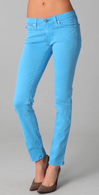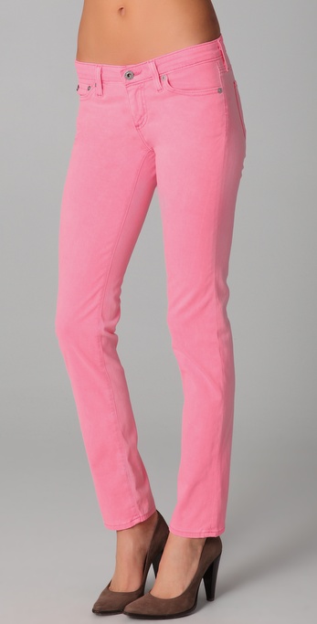 Colored jeans have been hot all year. For spring, try wearing jeans in a pastel hue with a bright colored top or a neutral, such as taupe or white. AG Adriano Goldschmied offers the stilt cigarette jeans in highlighter blue or neon pink. $159. Tractor jeans "Diedre" cotton-spandex jeans, $82, in mint green. J Brand Mid-Rise Overdyed Skinny Leg Jean, $169, in a variety of colors.