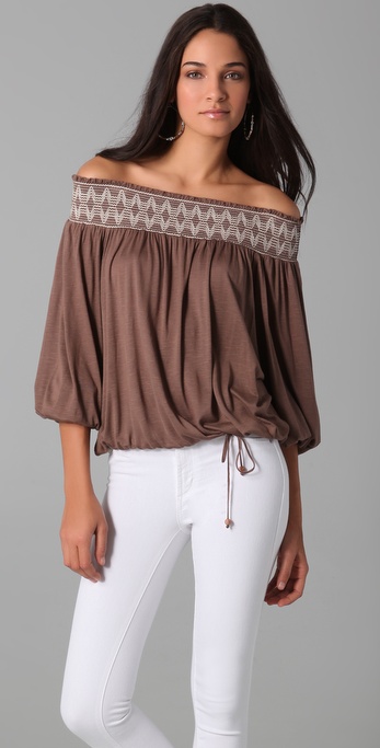 Off the Shoulder- dare to bare your shoulders in an off the shoulder top or dress. This look differs from strapless which is nothing on the arms. Off the shoulder has a scooped or straight neckline with sleeves.
