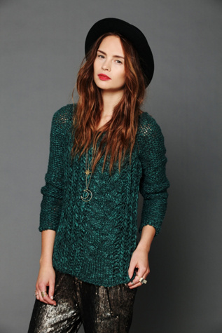 This Free People knit sweater pairs well with large gold accessories. Winter white pants, leather leggings, or navy blue cord's pair well with it. $98